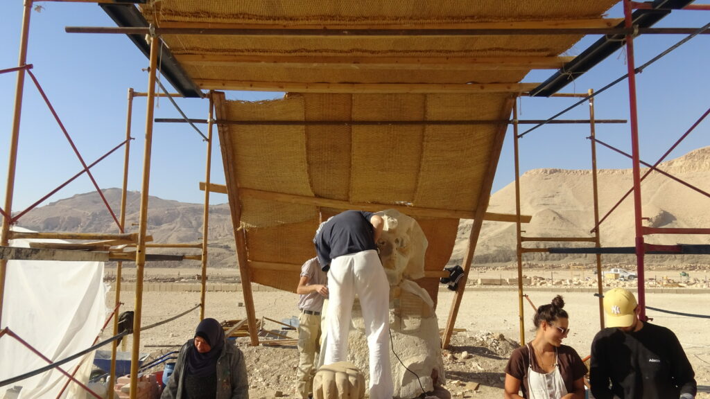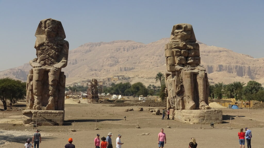 At the end, we stopped by the Colossi of Memnon, and at some point one guy climbed one of them and for in-between the stones of its chest! We assume as part of some restoration. We also found that the colossi stood in front of the first pylon of a temple almost as huge as Karnak. Then when it fell in an earthquake, the subsequent kings just took the materials and reused them in new buildings!