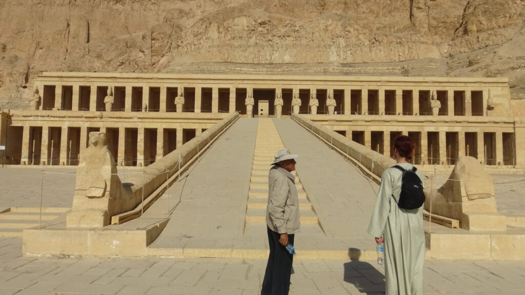 It takes almost an hour to drive there, since the bridge to cross the river is way out of town. Still, we made it to Hatshepsut before 8am, and it was great, because it was pretty much empty! Ahmed said people normally do the Valley first, and that’s why it’s good to come here early. He gave us an excellent tour – poor Queen, with all of her cartouches erased! We spent a fair amount of time exploring, saw the Polish archeological team restoring a sphinx with an angle grinder, and then got told off for trying to climb a slope to other tombs.